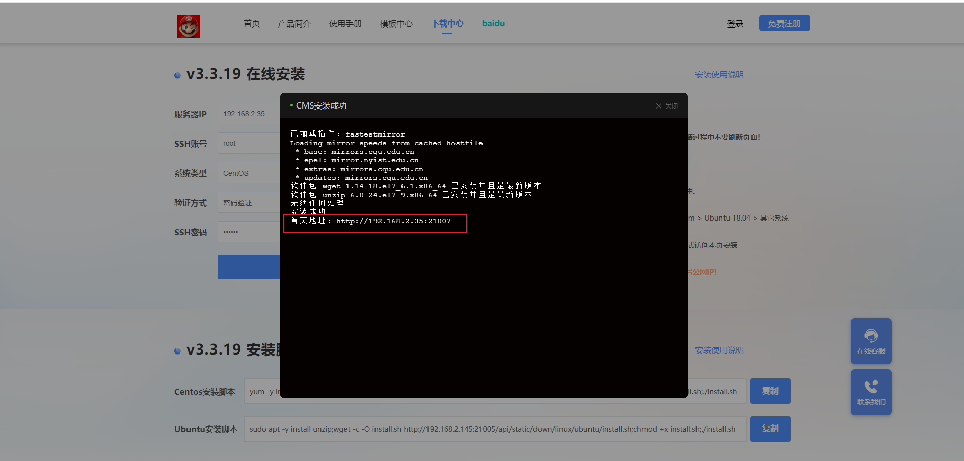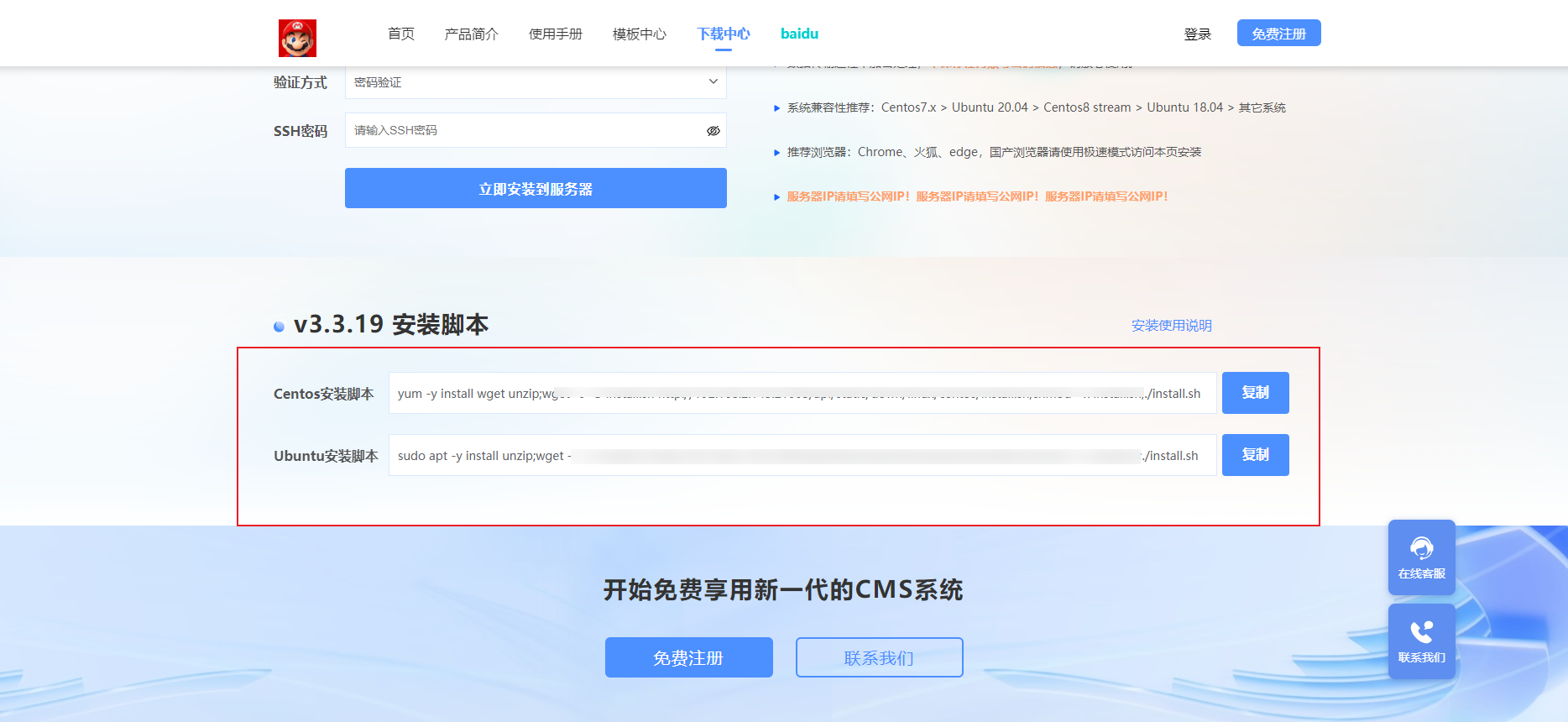访问CMS官网 -- 进入【下载中心】,下载Linux版本安装包,放置在安装目录下