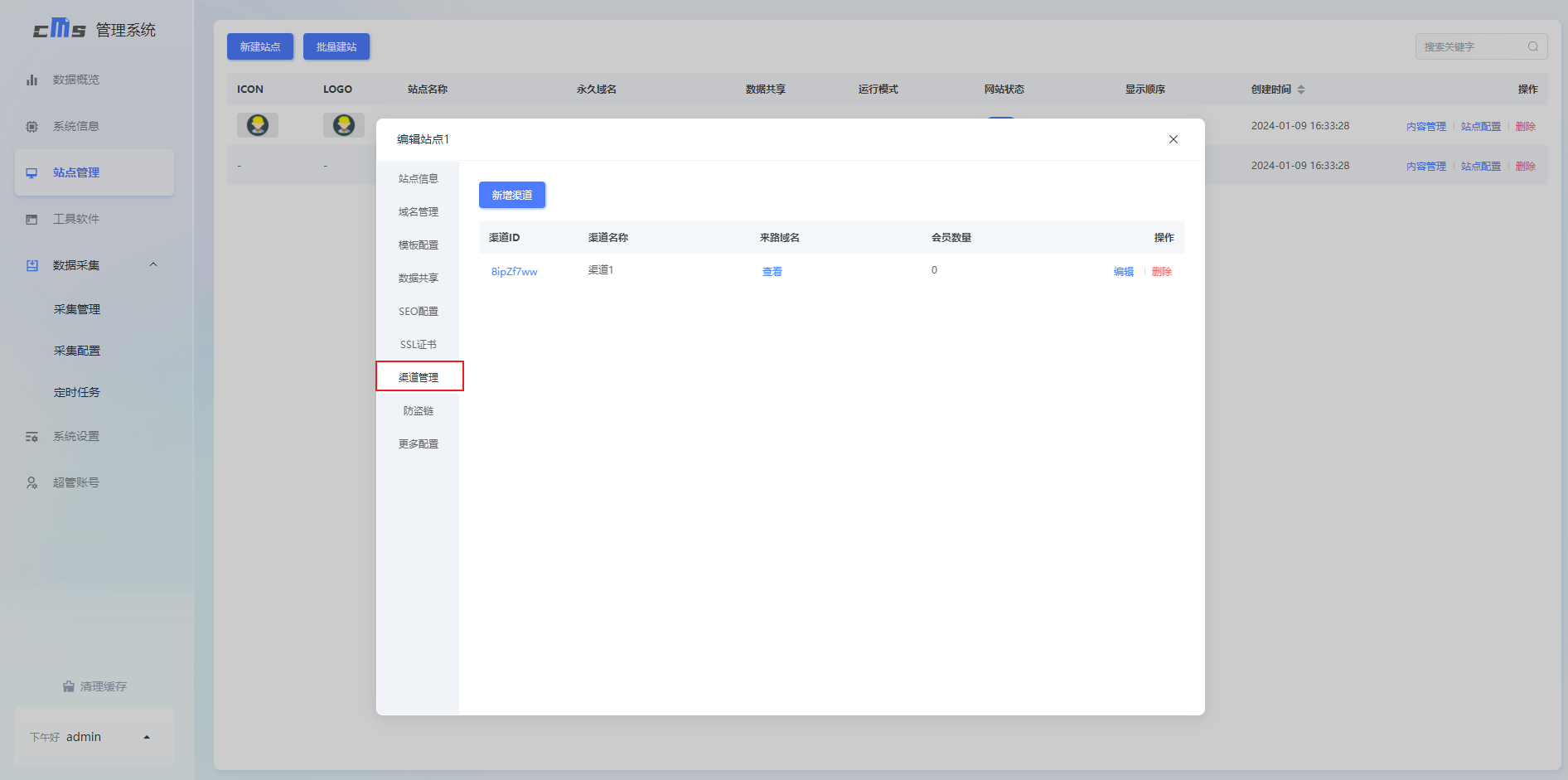 cms站点可以将不同的域名归属于不同渠道,方便对域名进行管理,同时用户访问对应域名注册登录后,系统会将注册量和访问量归属于对应的渠道,以便可以快速掌握前台用户情况