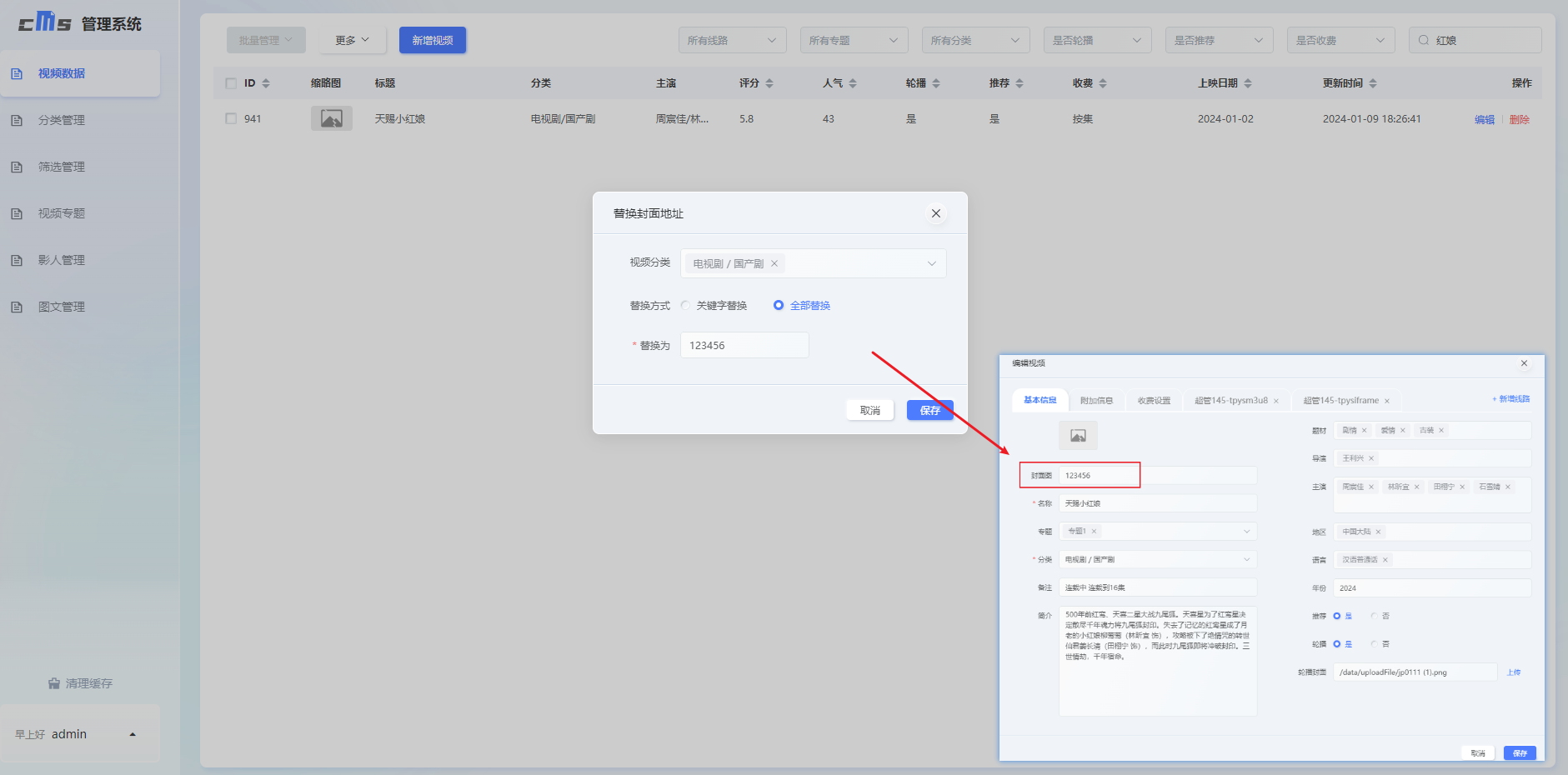6.影片替换封面操作,可以将视频分类下的影片封面地址按照关键词局部替换或全部替换,提高对影片封面修改的效率